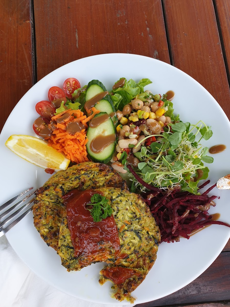 Lunch at Grumpy & Sweetheart's offers a range of salads and savoury items. The zucchini fritters are a consistent crowd favourite, and the zucchini and quinoa fritters provide a wholesome variation. The roast vegetable salad appeals to guests who want something colourful and nutritious.
